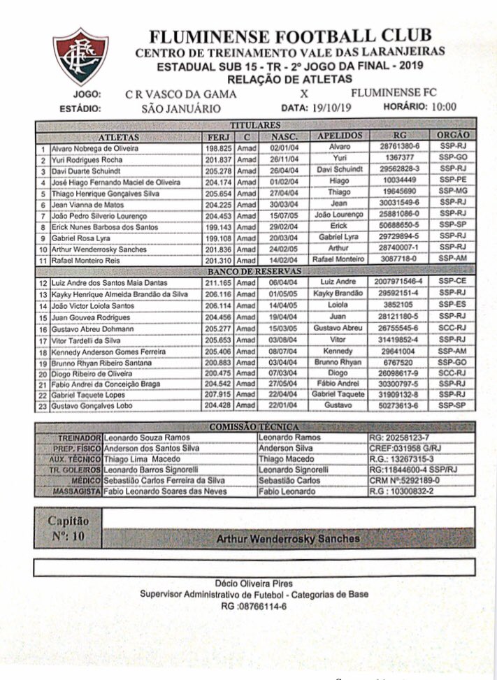 Escalação oficial do Fluminense para enfrentar o Vasco, pela decisão da Taça Rio sub-15, em São Januário: Álvaro, Yuri, Davi, Hiago e Thiago; Jean, João Lourenço e Erick; Gabriel Arthur e Rafael; Tec: Leonardo Ramos.