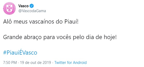 Via Twitter, Vasco parabeniza piauienses pelo Dia do Piauí
