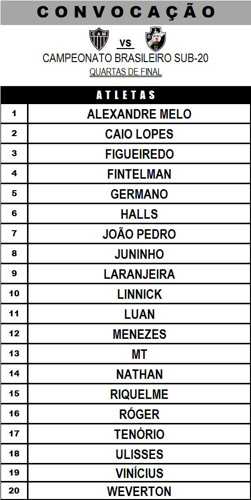 Esta é a lista de relacionados do Vasco sub-20 para enfrentar o Atlético-MG, no Estádio das Alterosas, às 16h, pelo jogo de ida das quartas de final do Brasileirão sub-20.