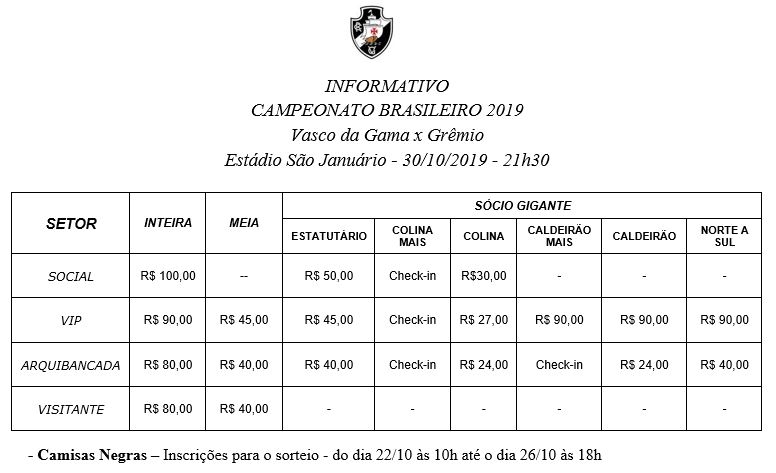 Gratuidade poderá ser retirada APENAS EM SÃO JANUÁRIO NO SETOR ARQUIBANCADA: a retirada da gratuidade estará disponível nos dias 28 e 29 de outubro, em São Januário. Será na Bilheteria 11 para Torcida Vasco e na Bilheteria Mega Loja para Sócio Gigante, mediante apresentação do CPF e RG original ou cópia autenticada.