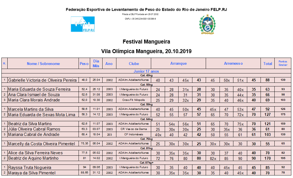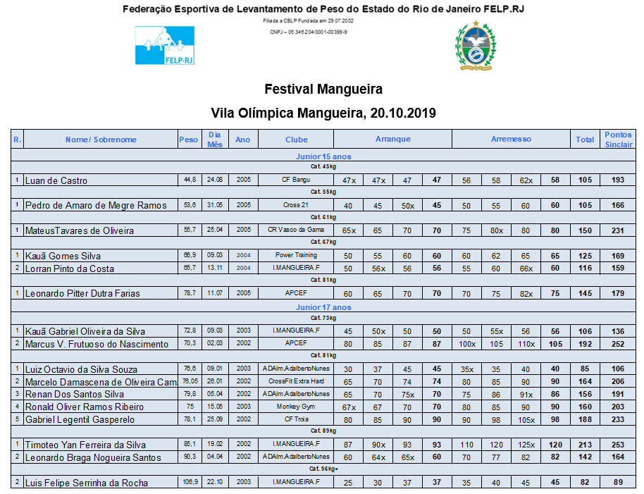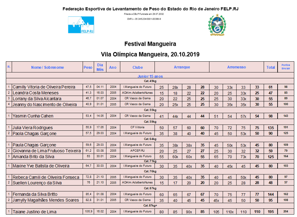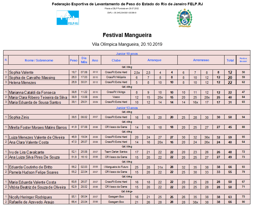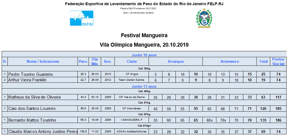 Foi realizado no último domingo (20/10), na Vila Olímpica da Mangueira, o Festival Mangueira do Futuro de Levantamento de Peso Júnior, reunindo atletas de 10 a 17 anos. Os vascaínos conquistaram 4 medalhas de ouro, 6 de prata e 1 de bronze. Confira, abaixo, os resultados: