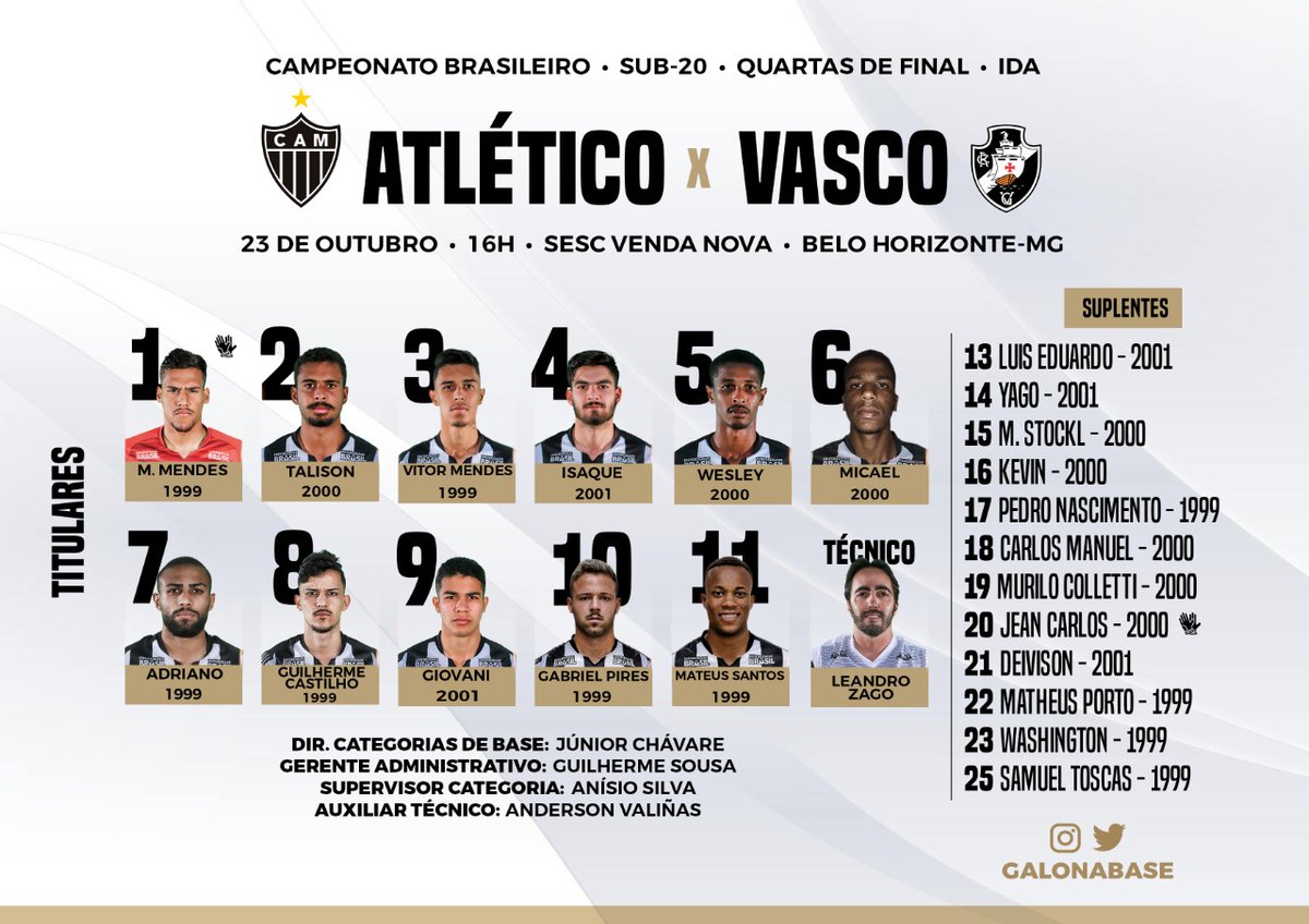 ⚽ Sub-20 enfrenta o Vasco, às 16h desta quarta, no Sesc Venda Nova, no jogo de ida das quartas de final do Brasileiro da categoria.
