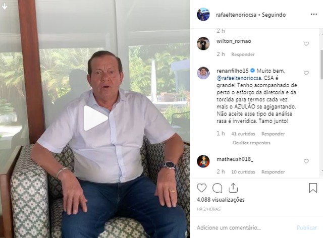 - Muito bem, @rafaeltenoriocsa. CSA é grande! Tenho acompanhado de perto o esforço da diretoria e da torcida para termos cada vez mais o AZULÃO se agigantando. Não aceite esse tipo de análise rasa é inverídica. Tamo junto! - comentou o governador.