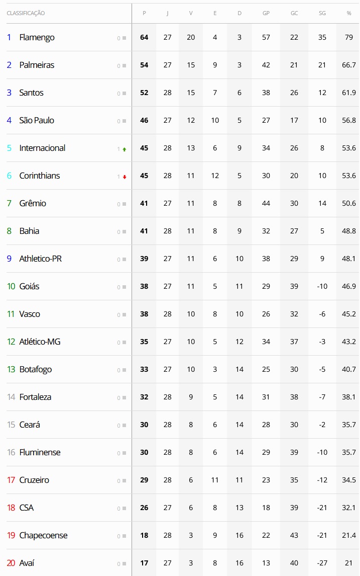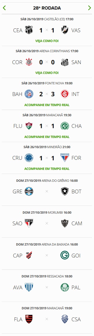 Após os jogos de sábado da 28ª rodada do Campeonato Brasileiro, o Vasco, que empatou com o Ceará por 1 a 1, segue em 11º lugar. O Gigante da Colina só terminará a rodada em 12º se o Atético-MG vencer o São Paulo neste domingo.