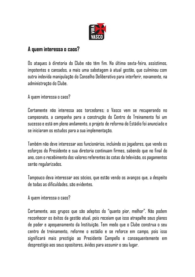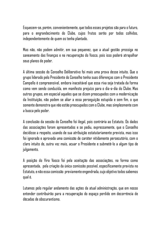 Em segundo lugar, cabe ressaltar, ainda, que a agenda do Ao Vasco Tudo sempre corresponderá ao interesse dos vascaínos, não importando o predicado de sermos situação, oposição, parte da gestão ou não. Sobredita característica do grupo é bandeira inegociável, alicerçada em nossos valores e princípios. Embasados nisso é que apoiamos a convocação do presidente Alexandre Campello para conceder as devidas explicações.