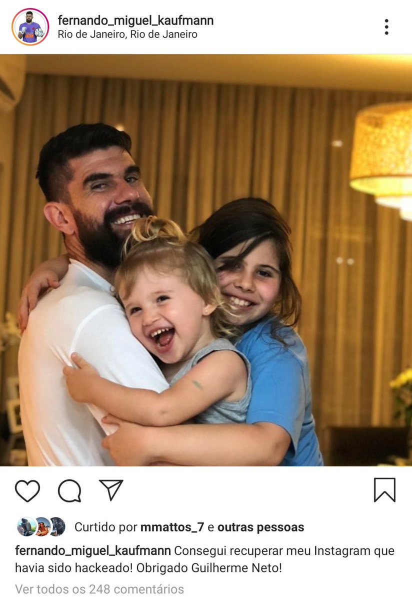 Fernando Miguel postou uma foto com suas filhas avisando que recuperou seu Instagram e agradece ao @GuiNeto3 pela ajuda no processo. Ele está de volta! ?⚽