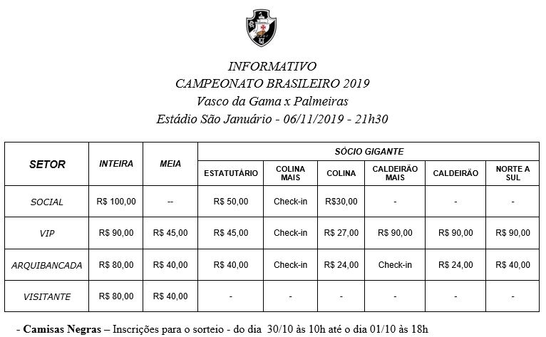 • Crianças: torcedores menores de 12 anos não pagam ingressos, apresentando CPF e RG original ou cópia autenticada. O seu representante legal deverá retirar a gratuidade do menor nas bilheterias de São Januário. Torcedores que tiverem completado 12 anos pagam preço de meia-entrada. O representante legal deverá apresentar ou adquirir no ato ingresso para o mesmo setor da gratuidade.