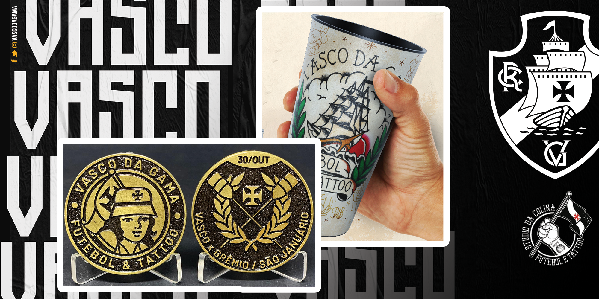 Vasco lança copo e moeda temáticos do Studio da Colina: 'Vasco da Gama Futebol e Tattoo'; veja