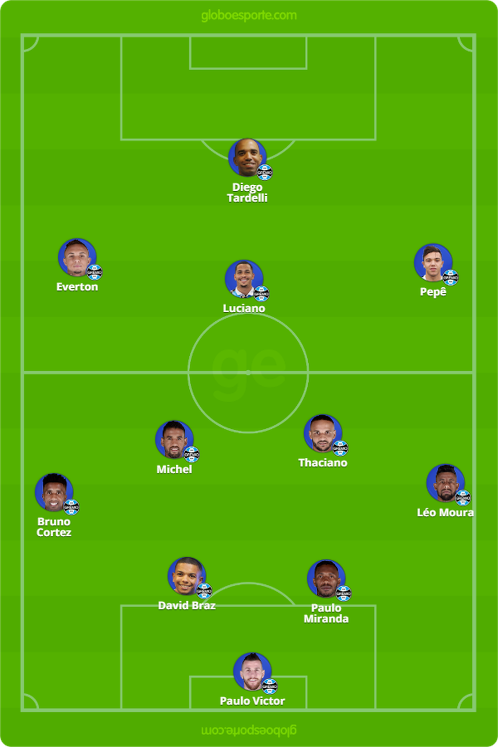 Quem está fora: Felipe Vizeu, Marcelo Oliveira, Leonardo, Jean Pyerre, Luan, Geromel, Alisson, Maicon (machucados), Kannemann e Matheus Henrique (suspensos) e Galhardo (pertence ao Vasco).