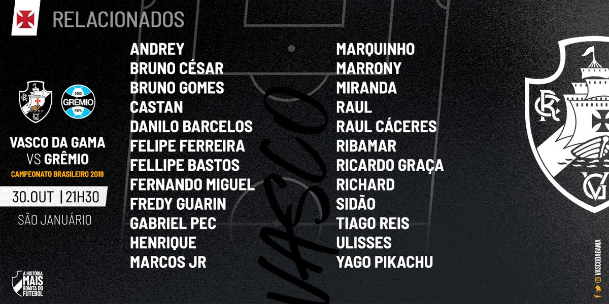 30/10/19 - Confira os desfalques e pendurados de Vasco e Grêmio