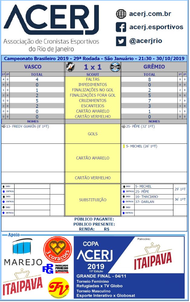 30/10/19 - Palpite NETVASCO: O resultado mais palpitado foi Vasco 2 x 0 Grêmio