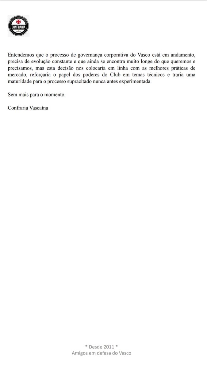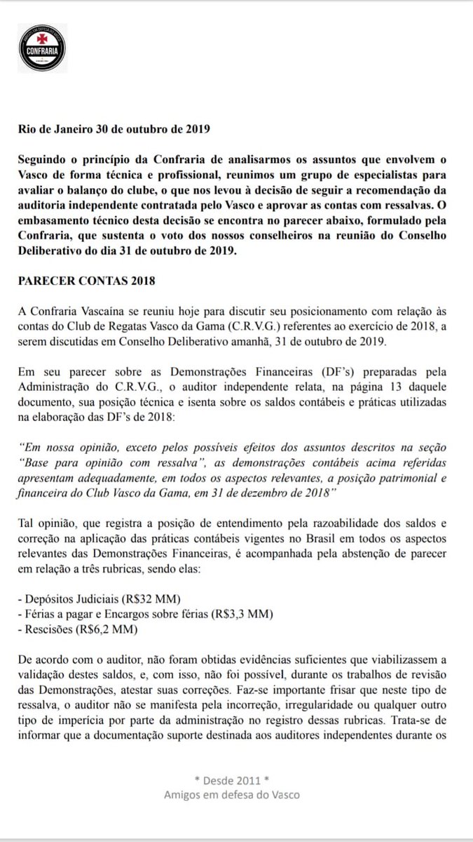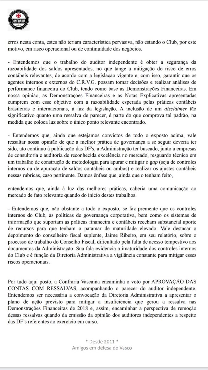 A Cruzada Vascaina reitera a confiança nas demonstrações financeiras apresentadas e votará pela aprovação das contas de 2018.