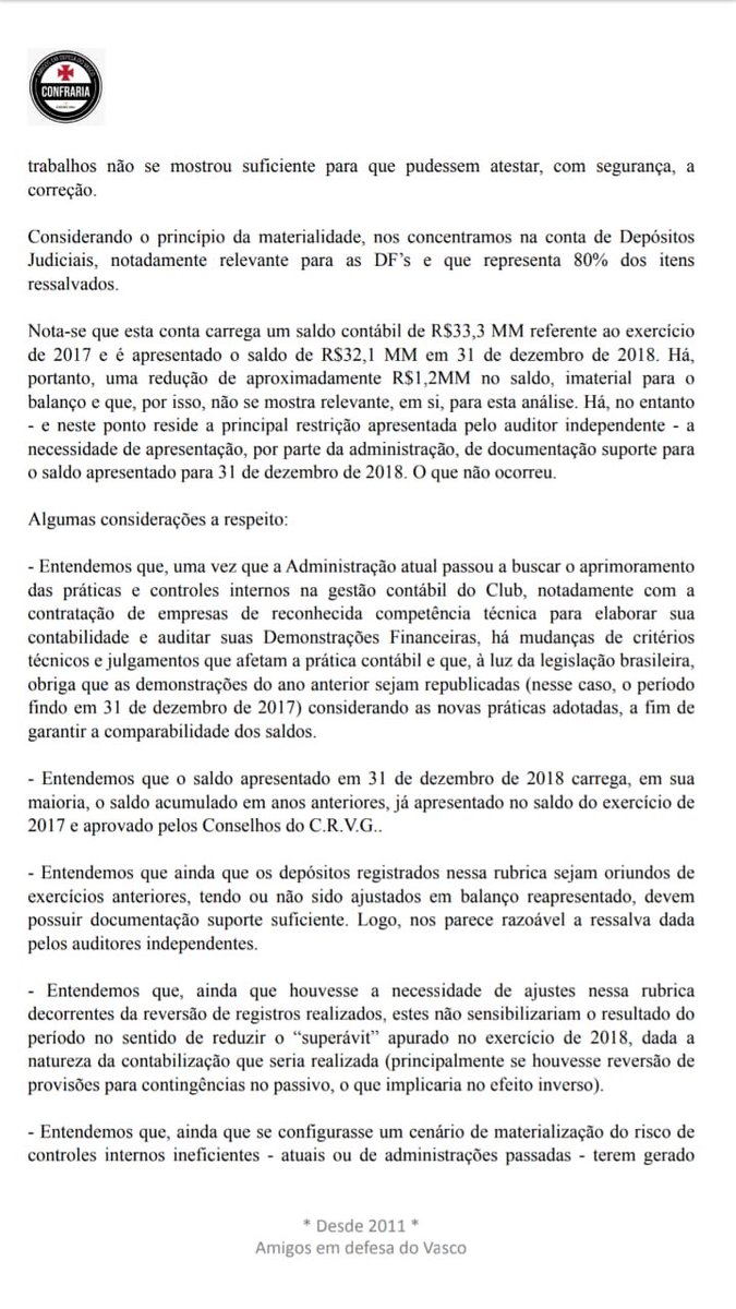 2) Além do ponto acima, muito se debate a respeito das ressalvas contidas nas Demonstrações Financeiras do Clube. Uma ressalva em um parecer de auditoria significa um erro encontrado não corrigido ou uma ausência de opinião sobre determinada conta em detrimento de falta de evidências. Porém, sem efeito disseminado e pervasivo sobre as Demonstrações Financeiras. Entendemos que as ressalvas contidas no parecer de auditoria da BDO devem ser, em caráter obrigatório, mitigados para a data base de 31/12/2019. Recomendamos aos gestores do Clube a baixa dos valores de depósitos judiciais contra o resultado do exercício, na hipótese de não obtenção das evidências para apresentar a empresa contratada. Adicionalmente, solicitamos ao Clube que avalie a existência, integridade, precisão (assertivas de auditoria) dos valores de férias, encargos e rescisões a pagar. Cobraremos para que estes pontos sejam esclarecidos, entretanto, não consideramos que sejam suficientes para ensejar a reprovação das contas do Clube.