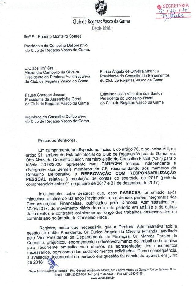 Aos que perguntam se minha atuação era igual na época do presidente anterior, abaixo deixo o parecer emitido nas duas últimas contas da gestão Eurico Miranda, onde recomendei a REPROVAÇÃO DAS CONTAS DE 2016 e 2017, por terem erros gravíssimos e não serem auditadas.