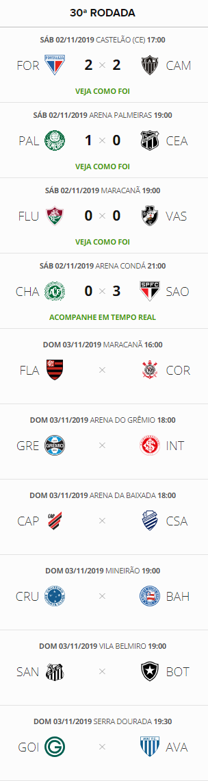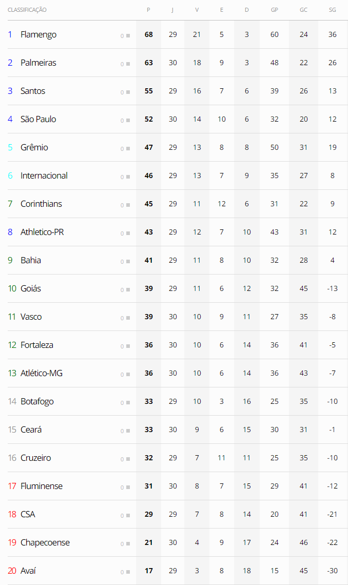 Após os jogos de sábado da 30ª rodada do Campeonato Brasileiro, o Vasco, que empatou com o Fluminense por 0 a 0, segue em 11º lugar. O Gigante da Colina não pode mais ser ultrapassado nesta rodada. A diferença para a zona de rebaixamento (8 pontos) pode diminuir se o CSA vencer o Athletico-PR em Curitiba.