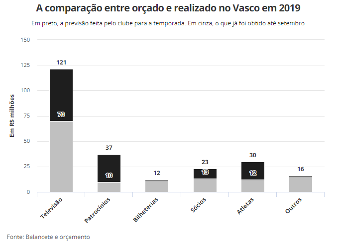 Para entender como anda a arrecadação vascaína, comparamos os valores que tinham sido projetados pelo departamento financeiro do clube, em seu orçamento, com os que foram efetivamente realizados.