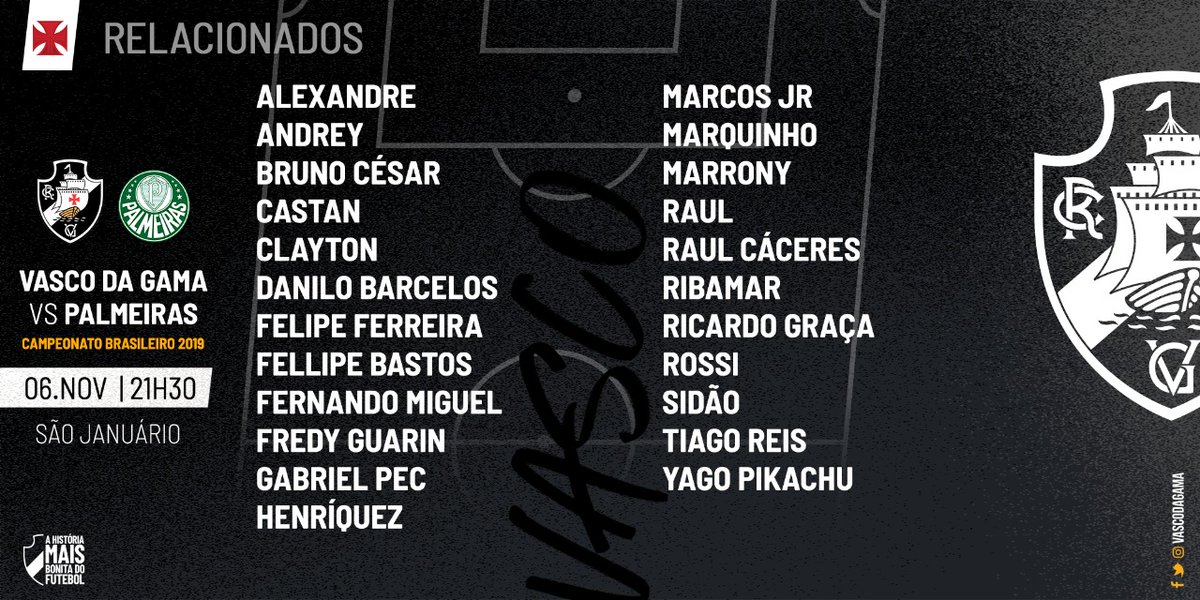 Confira os relacionados do Vasco para o jogo contra o Palmeiras