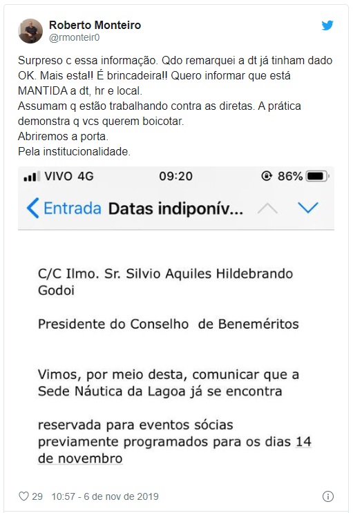 Sede da Lagoa está reservada para evento no dia da reunião do CD marcada por Roberto Monteiro