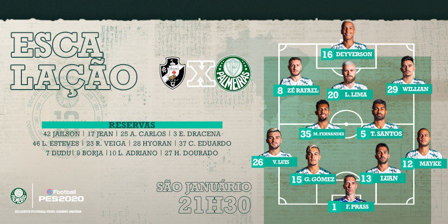 Veja a escalação do Palmeiras para o jogo contra o Vasco; ex-vascaínos Fernando Prass e Luan são titulares