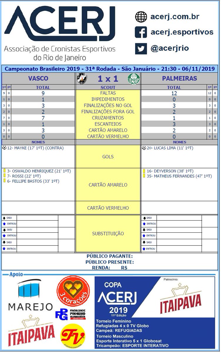 Scout do 1º Tempo de Vasco e Palmeiras pela 31ª Rodada do Campeonato Brasileiro 2019 no Maracanã #acerjinforma #VASxPAL #Brasileirão2019