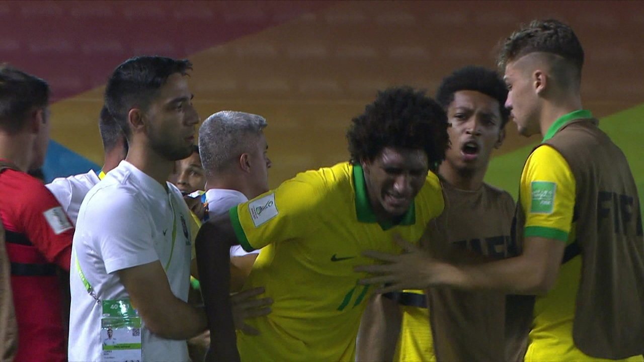 O Brasil, que já tinha feito as três substituições, ficou com um a menos até o apito final. Do lado de fora, Talles apareceu chorando após o fim do jogo no Bezerrão.