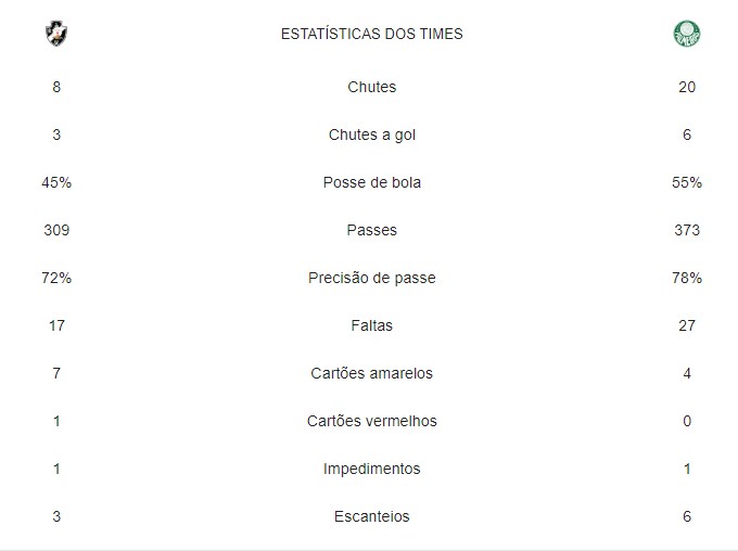 Cartões amarelos: Henriquez, Felipe Bastos, Bruno César, Rossi, Danilo Barcelos e Marrony (VAS); Deyverson, Matheus Fernandes, Lucas Lima, Zé Rafael (PAL)