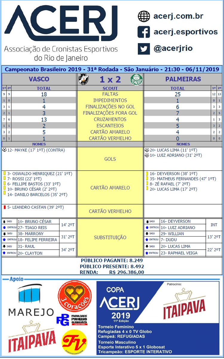 Scout Final de Vasco e Palmeiras pela 31ª Rodada do Campeonato Brasileiro 2019 no Maracanã #acerjinforma #VASxPAL #Brasileirão2019