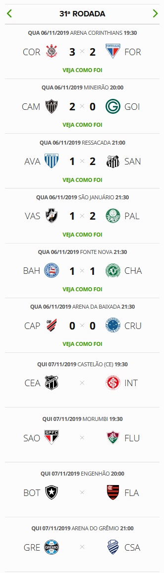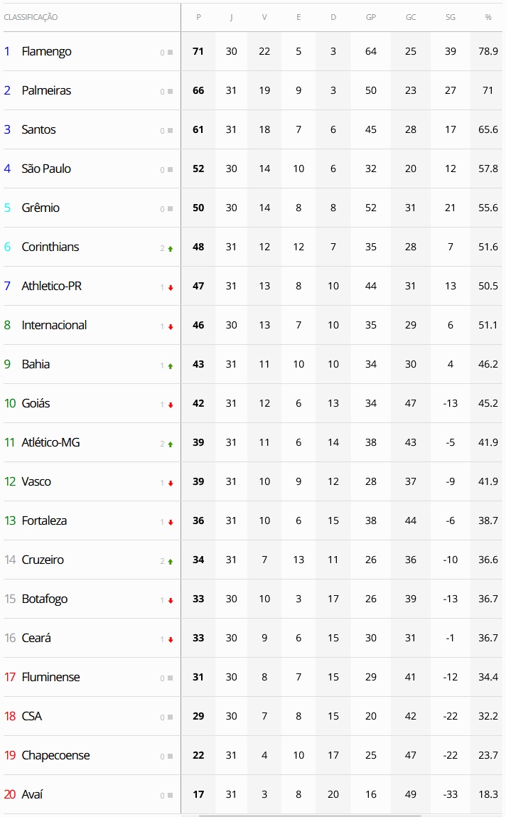 Com a derrota para o Palmeiras na noite de 4ª-feira, o Vasco perdeu uma posição e está agora em 12º lugar no Campeonato Brasileiro. Os 4 jogos restantes da 31ª rodada, que serão disputados nesta 5ª-feira, não mudarão a posição do Gigante da Colina.