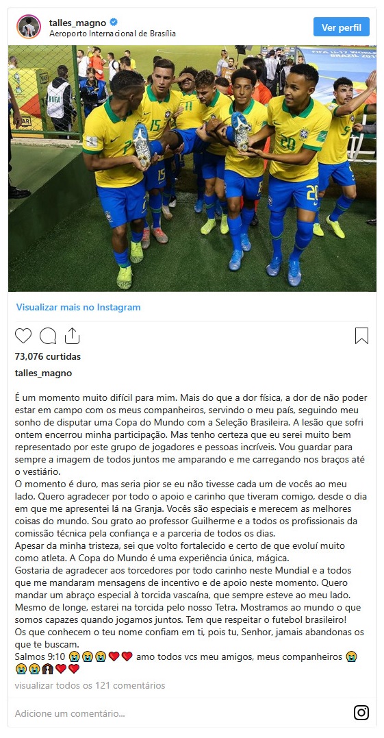 - É um momento muito difícil para mim. Mais do que a dor física, a dor de não poder estar em campo com os meus companheiros, servindo o meu país, seguindo meu sonho de disputar uma Copa do Mundo com a seleção brasileira. A lesão que sofri ontem encerrou minha participação. Mas tenho certeza que eu serei muito bem representado por este grupo de jogadores e pessoas incríveis. Vou guardar para sempre a imagem de todos juntos me amparando e me carregando nos braços até o vestiário. Apesar da minha tristeza, sei que volto fortalecido e certo de que evoluí muito como atleta – afirmou Talles.