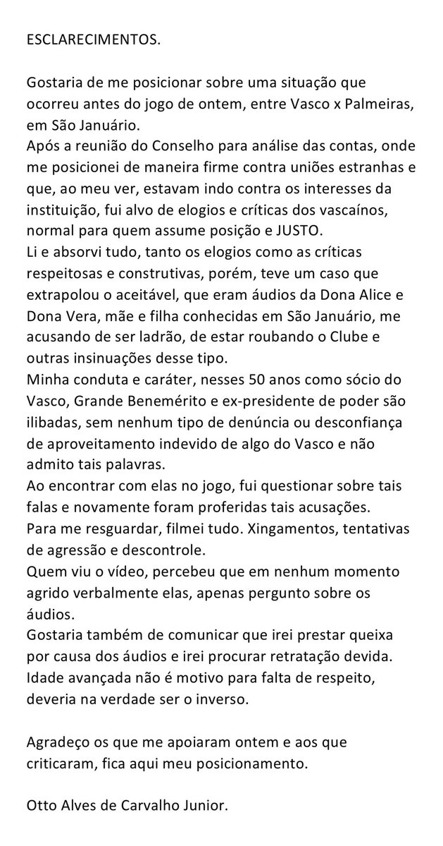 Otto Carvalho se posiciona sobre confusão em São Januário antes de Vasco x Palmeiras