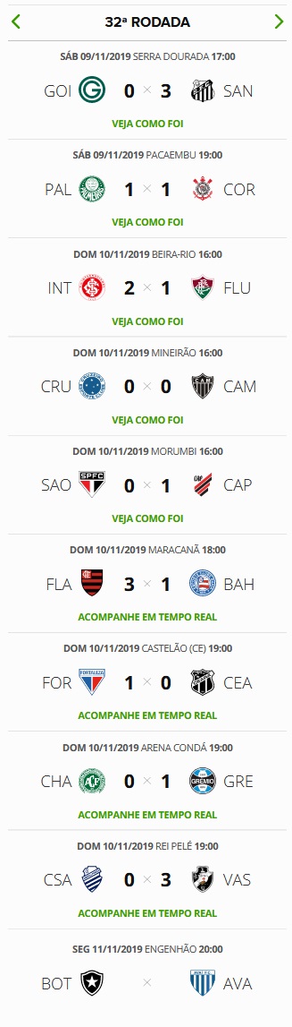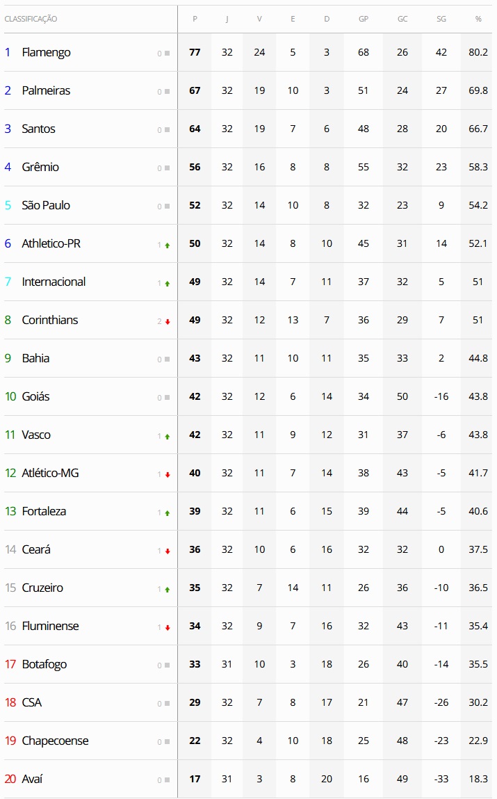 A um jogo do fim da 32ª rodada do Brasileiro, já é certo que o Vasco terminará a rodada em 11º lugar (ganhando uma posição em relação à 31ª rodada), a 7 pontos do G7 (pois o Athletico-PR, campeão da Copa do Brasil, está no G6) e a no mínimo 8 pontos (se o Botafogo ganhar do Avaí nesta 2ª-feira) do Z4.