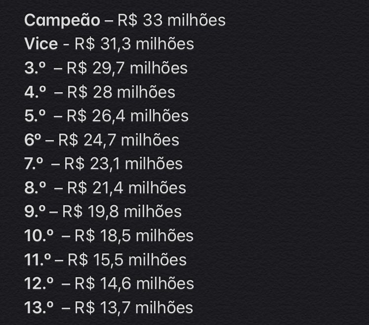 As premiações do Brasileirão por posição em 2019. O Vasco (veja na tabela @SofaScoreBR) está a um do Bahia, mas a diferença de premiação ultrapassa os R$ 4 milhões. Esse é o campeoanto do clube a partir de agora. Não tenha dúvidas. https://t.co/iII5bWMeF4