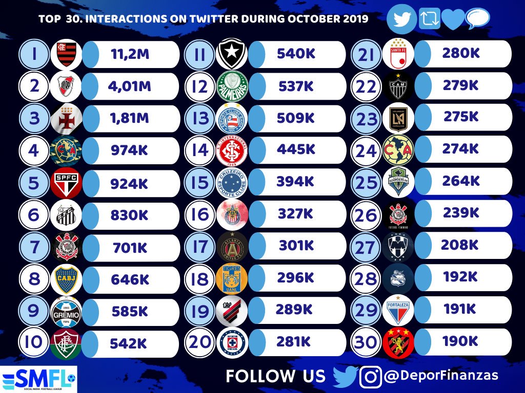 ⚽? Los 30 clubes de América con más interacciones en #twitter durante octubre 2019. ???