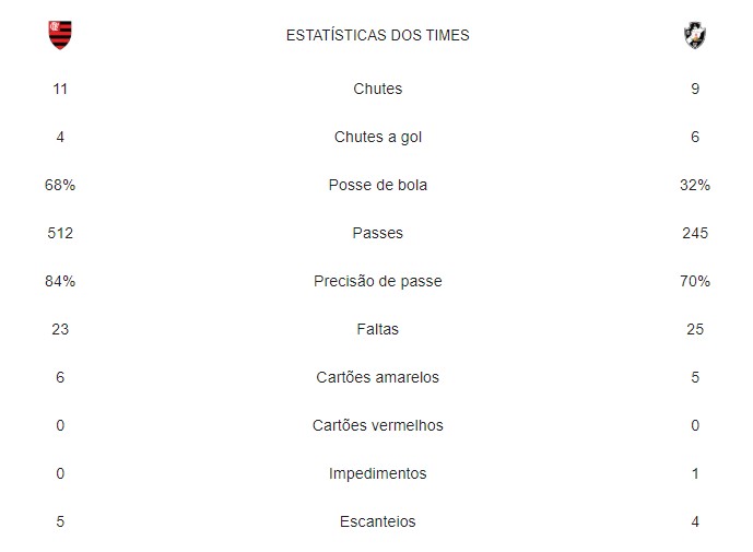 Cartões amarelos: Gabigol, Rafinha, Filipe Luís, Gerson, Bruno Henrique e Willian Arão (Flamengo); Richard, Marrony, Raul, Yago Pikachu e Rossi (Vasco)