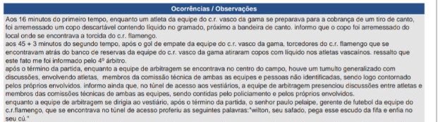 "Aos 16 minutos do primeiro tempo, enquanto um atleta da equipe do C.R. Vasco da Gama se preparava para a cobrança de um tiro de canto, foi arremessado um copo descartável contendo líquido no gramado, próximo à bandeira de canto. Informo que o copo foi arremessado do local onde se encontrava a torcida do C.R. Flamengo.
