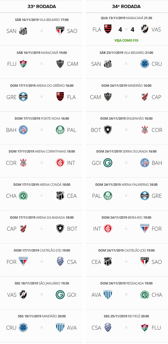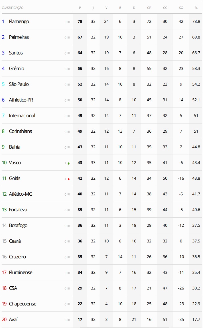 Com um jogo a mais do que a maioria dos demais participantes do Brasileiro, o Vasco, que empatou com o Flamengo por 4 a 4, subiu da 11ª para a 10ª posição, ultrapassando o Goiás, que, curiosamente é o seu próximo adversário, na 2ª-feira às 19h30, em São Januário.