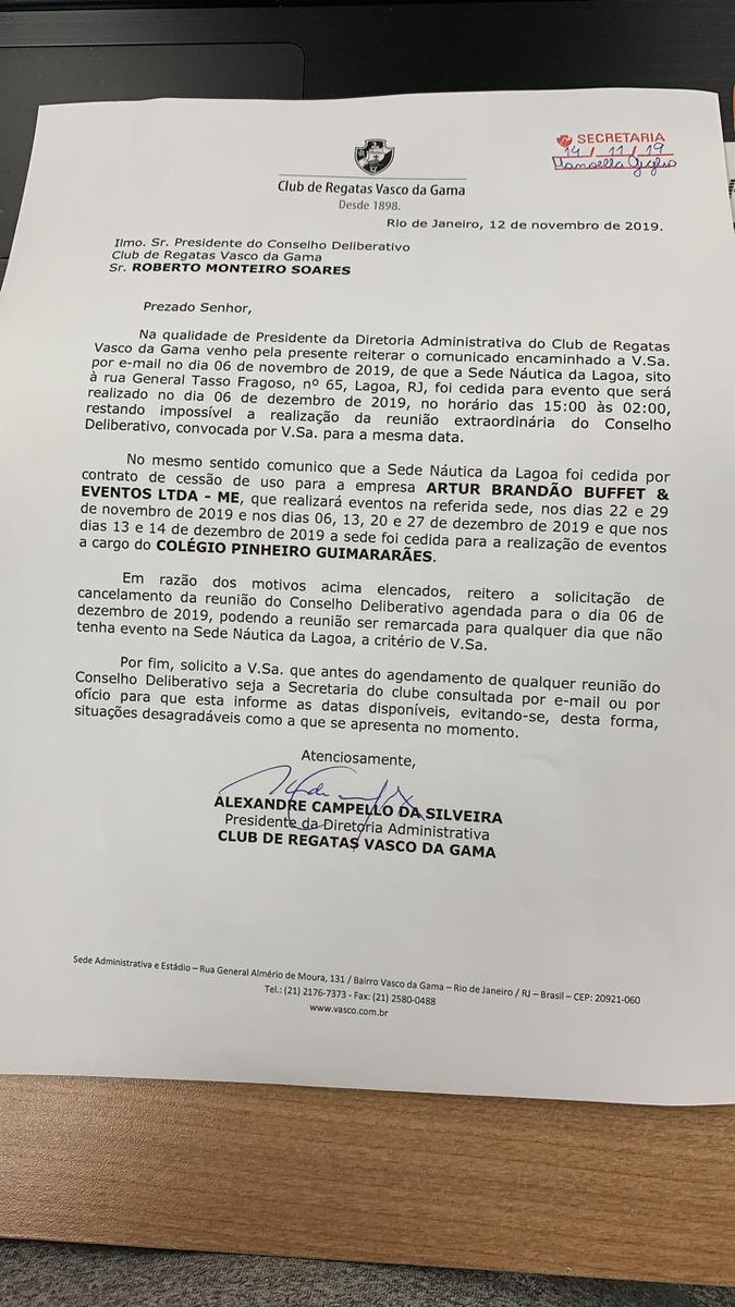 Campello protocolou na secretaria do Vasco comunicado a Roberto Monteiro informando sobre eventos sociais na sede da Lagoa nos dias 22 e 29 de novembro e 6, 13, 20 e 27 dezembro, o que inviabiliza a reunião do conselho para tratar de eleições diretas e reformas do estatuto