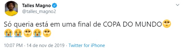12/11/19 - Via Twitter, Talles Magno agradece homenagem de companheiros da Seleção Sub-17
