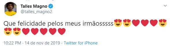 11/11/19 - No Twitter, Talles Magno comemora vitória sobre o CSA: 'Feliz demais por vcs irmãos'