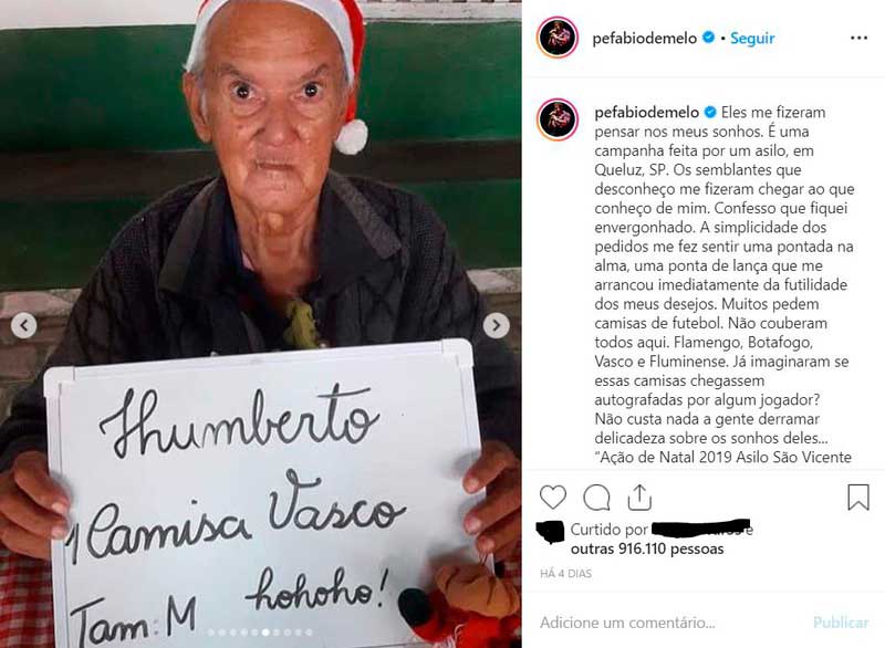 Em uma das postagens, onde os idosos aparecem segurando cartazes com seus pedidos de Natal, um deles aparece pedindo uma camisa do Vasco tamanho M.
