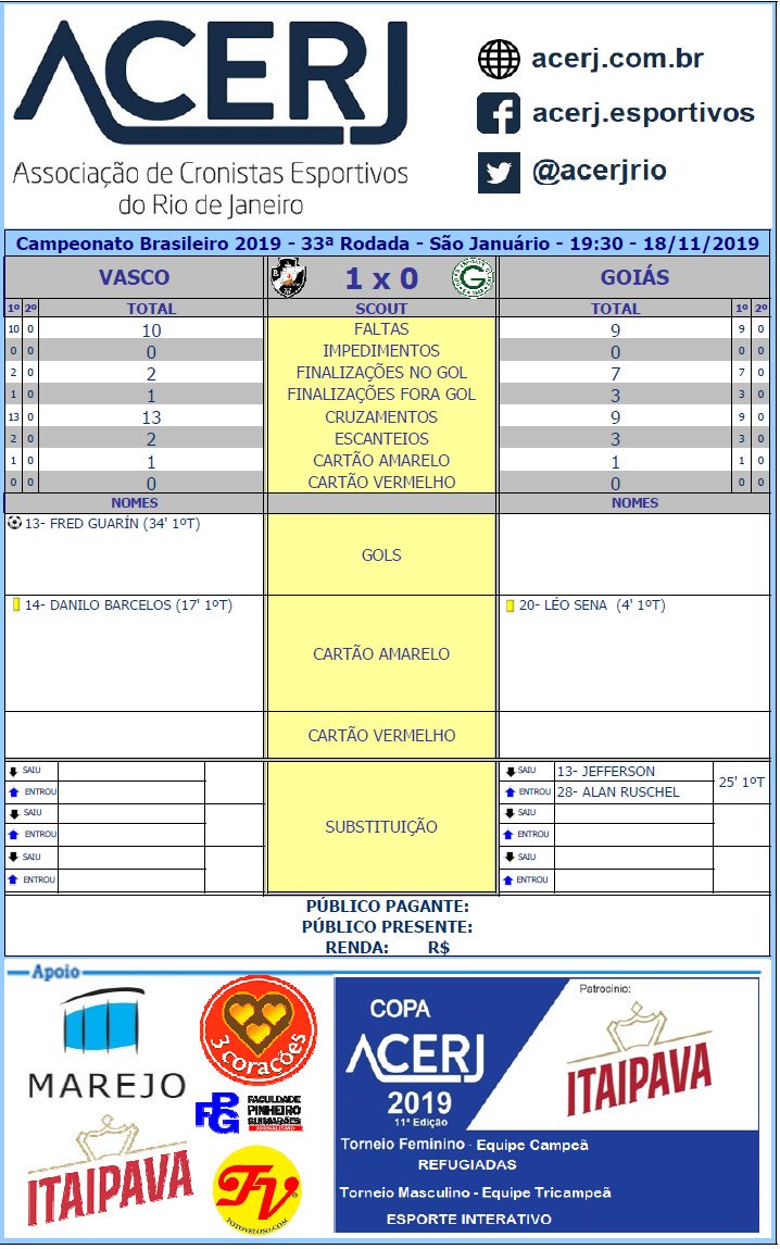 Scout do 1º Tempo de Vasco e Goiás pela 33ª Rodada do Campeonato Brasileiro 2019 no Maracanã #acerjinforma #VASxGOI #Brasileirão2019