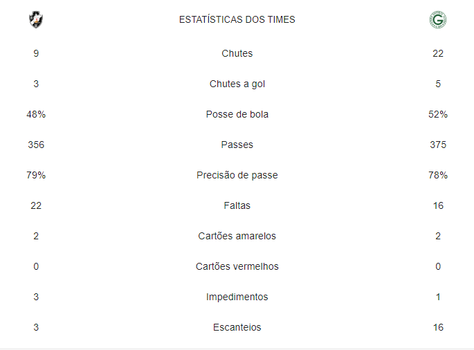 Cartões amarelos: Danilo Barcelos e Raul (Vasco); Léo Sena e Alan Ruschel (Goiás)