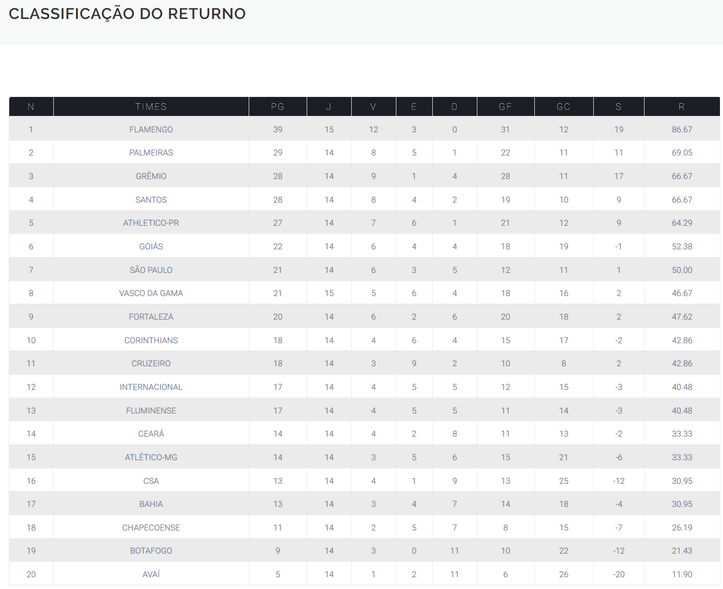 04/11/19 - Vasco está em 8º lugar no returno do Campeonato Brasileiro; veja classificação