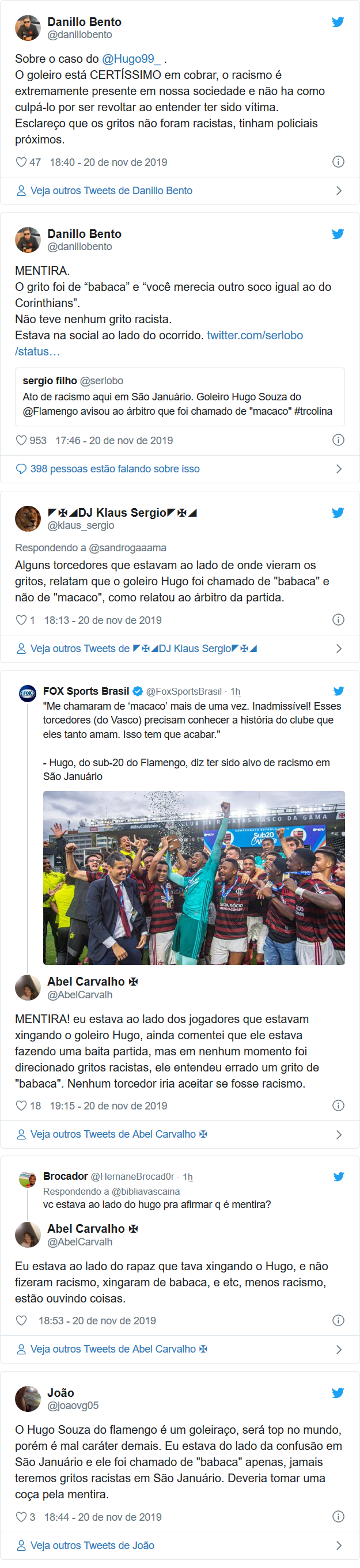 Nas redes sociais, torcedores do Vasco que dizem terem comparecido ao jogo, garantem que Hugo Souza confundiu a ofensa "babaca" com "macaco". Veja abaixo nos tuítes:
