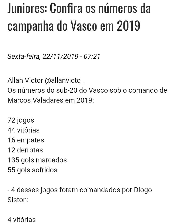 Foi um ano muito produtivo, sempre estivemos entre as melhores equipes do País, jogando um futebol técnico, criativo e envolvente, algo fundamental na formação de um jovem jogador. Com grande dificuldade estrutural e financeira, longe ainda de nossos principais rivais, demonstramos que estivemos neste patamar, principalmente pela dedicação diária de todos, a paixão pela profissão, a qualidade dos atletas e do trabalho. Diferente de alguns rivais, o sub 20 do Vasco sede com frequência atletas para o profissional, dificultando ainda mais as possíveis conquistas.