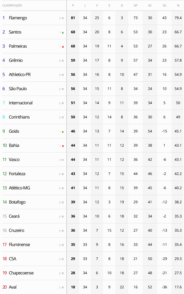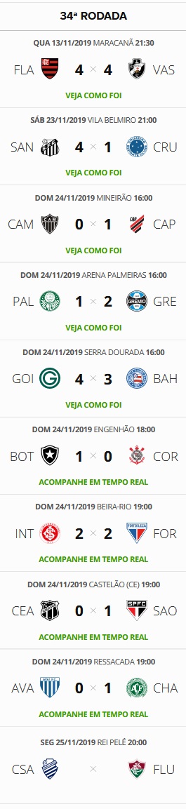 Após jogos de domingo da 34ª rodada do Campeonato Brasileiro, o Vasco (que fez seu jogo no dia 13/11 e empatou com o Flamengo por 4 a 4) perdeu uma posição e caiu para 11º. O Gigante da Colina, no entanto, segue a 6 pontos do G8 (zona da Libertadores - G8 porque os campeões da Copa do Brasil e da Libertadores estão no G6) e a 9 do Z4 (zona do rebaixamento).