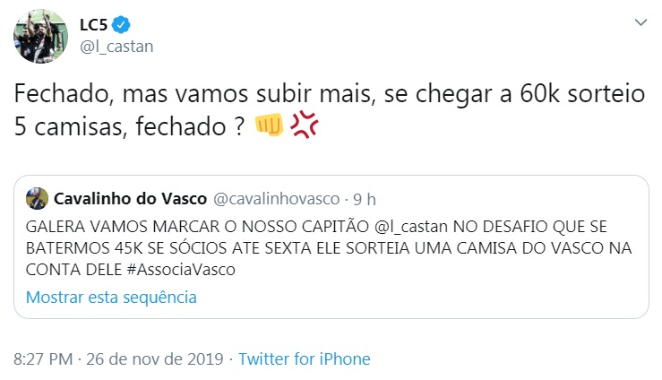 26/11/19 - Vasco chega a quase 40 mil sócios e publica: 'Não tem jeito... A torcida do Vasco é a mais braba'