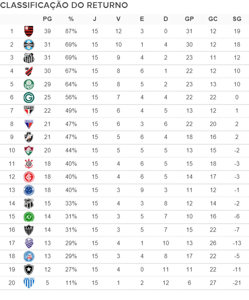 Na outra ponta da tabela, a rodada favoreceu a Chapecoense, que derrotou o Avaí no clássico catarinense e saltou da 18ª para a 15ª colocação, ajudando a alimentar o sonho de evitar o rebaixamento para a Série B do ano que vem.