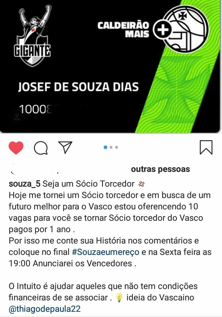 Souza diz em rede social que se tornou sócio do Vasco e oferece 10 unidades de sócio-torcedor