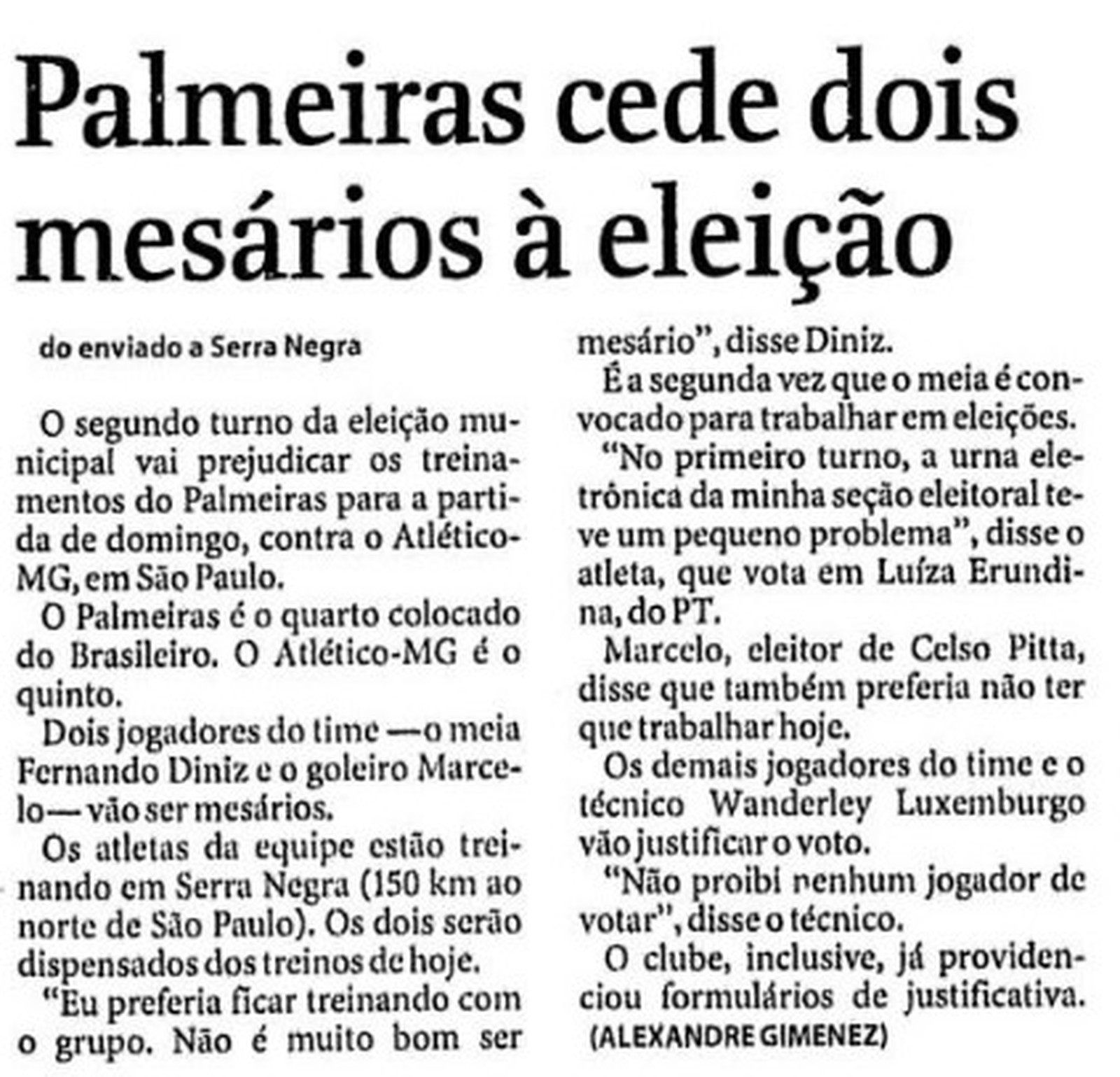 Além de Fernando Diniz, o goleiro Marcelo, reserva naquele Palmeiras, também foi liberado para ser mesário. Ele votou em Pitta. Os demais jogadores não votaram e tiveram de justificar.